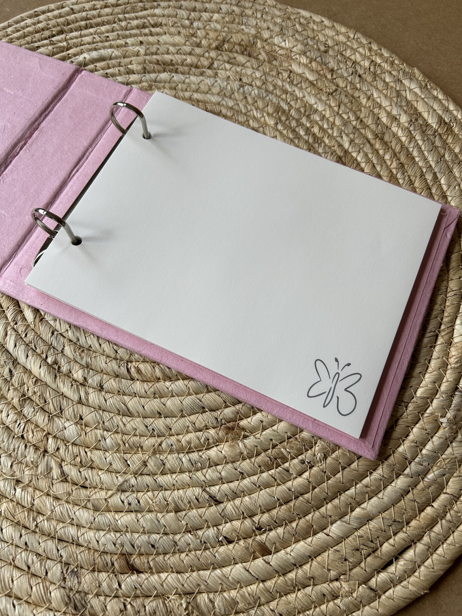 In het babyroze en babyblauwe boekje zit een vlindertje op de rechteronderzijde.